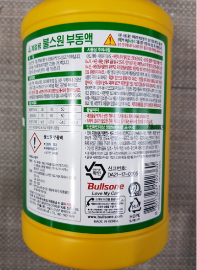 예시) 위 사진 보시면 '불스원 사계절용 부동액'인데 성분이 에틸렌 글리콜인 것을 확인하실 수 있습니다. 부동액 용기를 보면 모두 성분 표시가 되어 있으니 자신의 차량에 맞게 성분을 맞추어서 교환하시길 바랍니다.